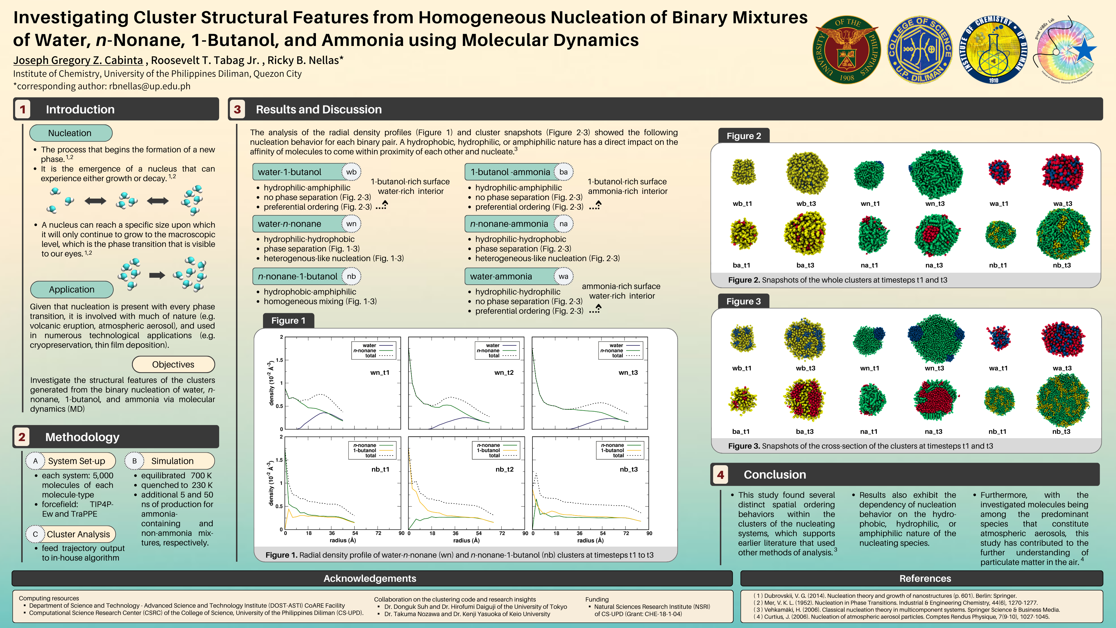 Undergraduate Thesis: Investigating homogenous nucleation in binary mixtures of water, n-nonane, 1-butano and ammonia using molecular dynamics. Nucleation (new phase emergence within a metastable phase) significantly impacts natural systems and technology. It plays a role in forming atmospheric aerosols, which affect human health and climate. Our study investigated binary nucleation of water, n-nonane, 1-butanol, and ammonia using molecular dynamics. Depending on the involved molecule, specific nucleation behavior was observed brought about by varying clustering affinities.