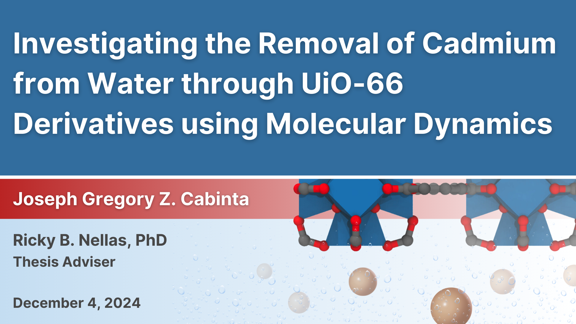 Masters Thesis: Investigating the removal of cadmium from water through UiO-66 functional derivatives using molecular dynamics. Zr-based metal-organic frameworks (MOFs) show promise for Cd(II) water treatment due to their water-stable nature and high surface area. This study explores MOF functionalization effects on heavy metal interactions, enhancing water treatment against Cd(II) contamination.
